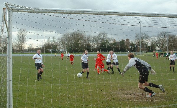 Above the Alty players rush out from their lines; l. to r. Paul Glynn, keeper Barry George, James Carty, Kelvin Lugsden, Greg Byrne, Josh Collins, Luke Killeen and Andy Smart. See the Home Page for a picture of Collins's goal.