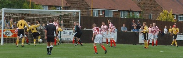 In fact, the home keeper Ryan Young took no goal-kicks during the game. Just as Alty fans were noting that their side had lasted longer without conceding a goal than the 62 seconds that elapsed before Vauxhall's first goal last Tuesday, Hucknall took the lead in the third minute (see photo, right).