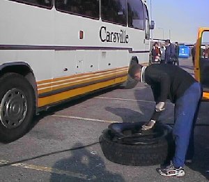 This was the Robins' first visit to Hucknall, who have risen from the Northern Counties East division in quick order. The Watnall Road pitch was hard and uneven, with a slight slope across it and it was the first surface we have played on this season to boast a crop of dandelions! The Club is a friendly one and the young lad who directed the car-park operations was to be particularly commended. He clearly has management potential and even tried, (sadly unsuccessfully), to secure us free sandwiches and beer when the supporters' coach was found to have a damaged tyre and fans were stuck in the car-park, as a result, till after 7pm. (see picture, above, as the A.T.S. repair man removes the damaged tyre from its rim).